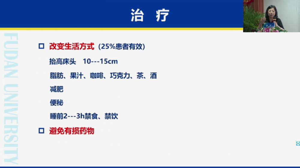 那么临床如何来治疗?治疗一个就是生活方式的改善,大家不要觉得这是一件小事,但事实上我们临床的体会,你如果给他正确的生活方式的指导,病人真的按照你的做了,25%到30%的人能够获益,这个获益包括轻的病人他能够完全好转,不需要吃药了,重的病人他可以药物的剂量减少了,有些很严重的病人,一辈子离不开这个PPI或者是P-CAB,这些如果做好了,特别是找到导致他胃食管反流病的原因了,去除了以后这些药就不需要吃了。记住饮食方面,酒、浓茶、过甜、过酸、脂肪含量过高的这些食物肯定是要避免的。还有建议病人晚上睡觉前两三个小时不要吃东西,你仔细的问很多病人会他是存在这个情况,他说呀医生我就是晚上吃东西,晚上睡觉前喝点牛奶有助睡眠。你自己仔细问,很多病人是在吃。还有些人喜欢吃坚果,说我肚子饿然后我想我想控制饮食但是肚子又饿,我睡觉之前我要吃点东西。好多人是有这个问题的,你把它改掉病人问题就解决了。