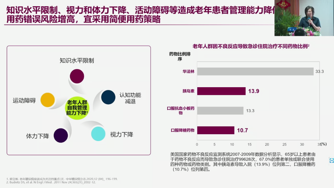 那么对糖尿病病人,如果你管他三高,糖尿病两三种、高血压两三种,再加一个血脂药,再加一个阿司匹林,完蛋了,就要10种了,所以这个就很麻烦,同时老年人随着年龄的增加,他的认知减退,有的本身这个知识水平不高,再加上运动障碍、体力下降、视力下降、听力下降,所以他理解医嘱的能力也是下降的,所以常常会造成这个用药的错误的风险明显的增加,所以我们的用药策略一定要简单,一定不好复杂,你太复杂了他搞也搞不清,那么就要闯祸了,所以特别是像胰岛素、华法林还有像这种容易引起低血糖的药物,都要越简单越好,尽量采用引起低血糖的药物,那么老年人的依从性也是明显的下降。