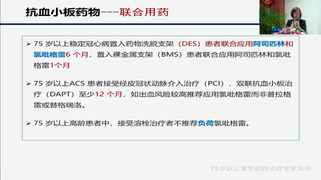 第二大类第二个问题就是时间到底多长?我们看到的常规如果说12个月,或者我们讲的一个双抗,如果是6个月9个月的话,从老年人的角度来说,我们一定是缩短的,联合用药药物的一个缩短和时间的一个缩短,这是我们对于老年抗血小板治疗时候所要关注的一个重点。