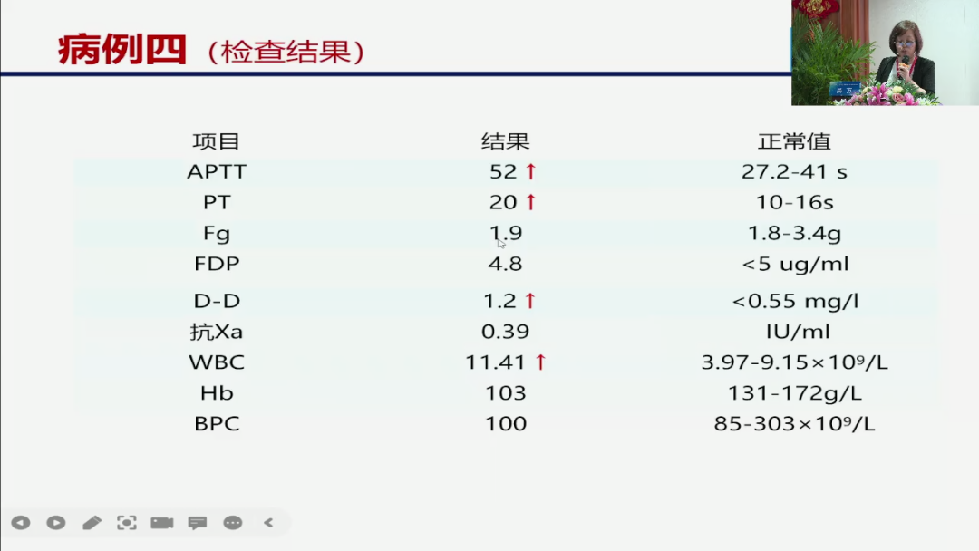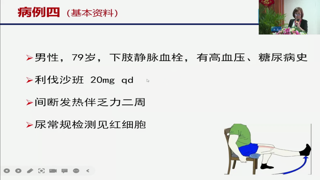 而第四类的一个病例,在临床上虽然不常见,但是他呢也和我们平时的一个所有的一个治疗呢,还有些不一样,他也是用了一个利伐沙班,由于由于他的一个下肢静脉的一个血栓的原因,但是他出现了一个血尿。