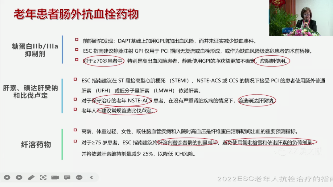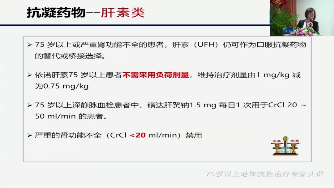 对于低分子肝素来说,目前比普通肝素应用的更加多,因为它皮下打的比较方便,而且半衰半衰期相对来说比较长,在我们临床上所有的药物选择当中,低分子肝素有三种是常用的,一个苏丙宁一个法安宁一个叫克赛,那么我们选择哪一种,我们看到所有的指南带老年人的都选阴诺肝素,也就是克赛为什么选这个药,这三个药物虽然说是同一个药但是它的一个,对靶点的一致是不一样的,那么伊诺肝素从这里面脱颖而出的一个理由,就在于它的一个出血的一个风险相对来说比较小,那么第三个,我们会常用的一个药就是磺达肝葵钠,我们商品名可能叫安卓,那么这个药现在目前在很多指的,它也是选在放在我们老年人相对来说比较前面的一个地位,那么为什么?主要这个药有两大好处:第一个它的一个出血比我们的低分子肝素可能还要低,第二大原因它比较方便,它是一天一次皮下注射的,当然肝素类药物的应用,我们一定要注意它,我们的一个肾功能,我们看结发小于20是我们是禁用的,而对于GPⅡbⅢA受体拮抗剂,我们只要注意,大于70岁的患者不要再去用,对于我们讲的其他的比伐卢定啊等等,我们是不建议使用的,因为这类药出血的概率太高。