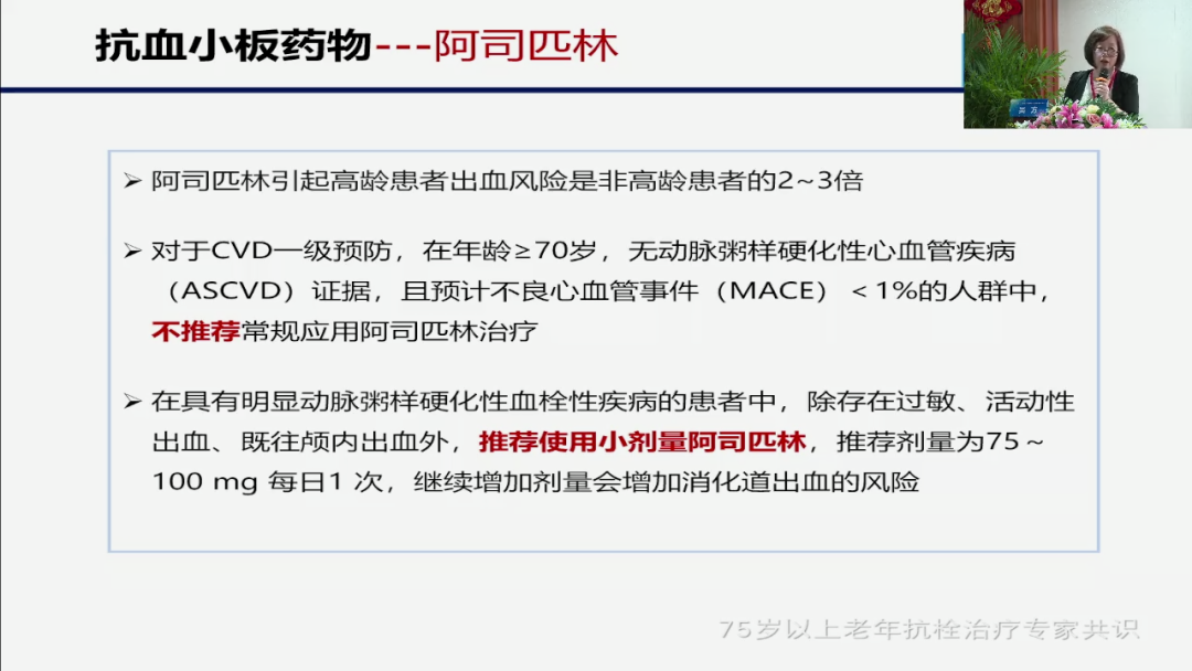 阿司匹林的应用在老年人和年轻人有什么区别?我们看到的是两点,由于他出血风险高,所以对CVD的一级预防就是我们讲心脑血管的一级预防,我们是什么叫:不推荐常规应用,那这句话也就告诉我们说,如果这个患者年龄大于70岁,那么你不要去用阿司匹林做一级预防,但是阿司匹林2级预防用完还是用的,那注意的就是一个剂量,所谓推荐小剂量,那这个小剂量的位置在哪?就是75-100毫克,我用25毫克可以吧?50毫克可以吧?可以的前提是什么?那后面我们就会谈到,我们抗血小板药物如何去给它监测?如何确定他的一个有效性?