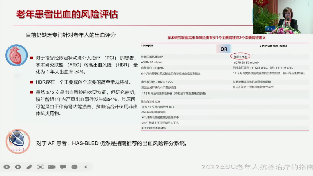 在我们目前的一个,整个的一个出血管理当中,我们肯定的首先要看到叫一个出血风险的评估,大家可能熟悉一个叫HAS-BLED的评估,但是我们要看到这个HAS-BLED评分,它是针对房颤患者的,对于其他患者我们怎么办?我们有一个叫学术研究联盟的一个叫高出血风险的一个评分,那这个评分来说它告诉我们主要的一个风险以及一个次要的风险,在这我给大家标示了说年龄大于75,它就是一个次要的一个风险,也就是说,我们老年人整体来说一定是一个出血的高危人群,你说我出血高危人群,评估了以后有什么用?评估了以后不是让你不用抗栓药,而是提醒你要进行一个密切的一个观察,以及密切的一个监测。