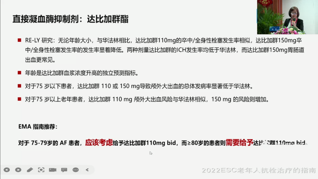 对于我们目前来说已经应用了十几年的,以前一直叫新型口服抗凝药,那么十几年用下来也不叫新型了,我们叫直接口服抗凝药,这个药我们老年人可以用吧,我们看到的达比加群,它最常讲的一个研究就是一个RE-LY,RE-LY研究告诉我们说,大于75岁以上的老年患者,他也可以用的,但是我们要注意一个质量的问题,因为这个药有两个剂量,一个是110mg一个是150mg,EMA的指南告诉我们说,他说75岁以上应该考虑110不要用150了,然后到80岁那肯定就是140的。