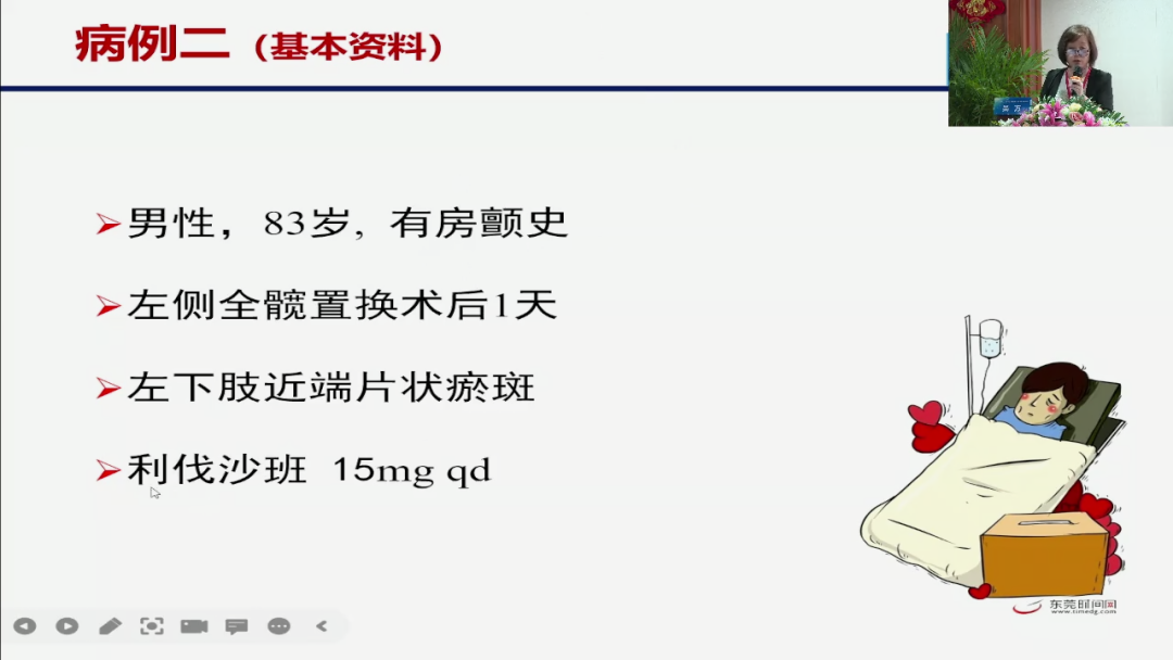 那这个时候他有左下肢有一个瘀斑,我们的现在骨科手术以后,我们常规24小时以后,肯定是进行抗凝的,原因是什么?就是我们的一个肺栓的一个概率发生太高,因为这个手术以后的一个骨科的抗衰,实际上是我们医院杨庆明主任摸索出来然后倡导的,因为他当时他发现,他骨科手术做了很好,做了半天最后病人死掉了,什么原因?最后实际上是一个肺栓,所以现在是一个常规的我们骨科手术以后就是要抗衰,但是这个人用抗凝药以后有瘀斑了,你到底还抗凝不抗凝,那这就,牵涉到我们新型口服抗凝药的一个监测,我们什采用什么样的一个指标来进行一个它的一个药物的一个使用?一个浓度的一个指导?