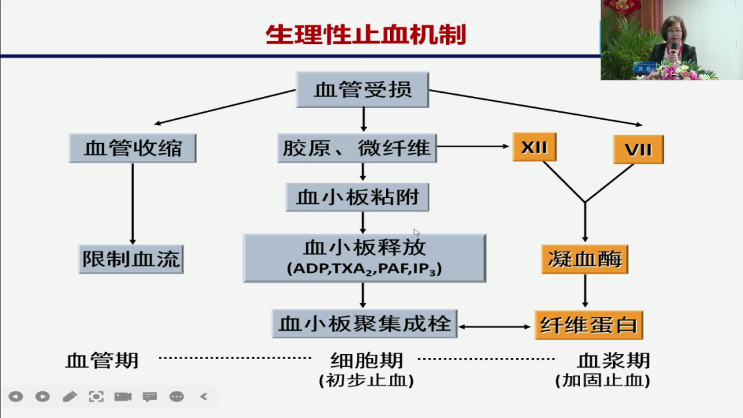 首先呢,想和大家复习一下,我们老年人的止凝血特点,也就是说相比于我们年轻人,我们老年人的止血和出血,他到底有什么不同的地方,看到这个图吗?实际上大家应该非常熟悉,因为为什么,可能大学时候我们就讲这个了,我们人体的所谓生理性止血机制有三大块,一个叫血管期,一个叫细胞期,一个叫血浆期,那所谓的一个血管,其就是你受伤以后无论是手术还是你生活当中的一个外伤那么出现了以后,马上身体的一个反应就是一个血管的收缩。那血管收缩以后它起了两个作用,第一个作用就是使得一个血流缓慢,第二个作用使得伤口出血,说起来也就是我们人体出于一个自身的一个保护使得我们的血液比较少的流出体外,而这种受损以后马上就有我们血管胶原的一个暴露,暴露以后会吸引一个东西,就是我们血液中循环的血小板,这个时候血小板就黏附上去了,它黏附的一个过程,同时它也是一个激活的过程,所以它就会释放一系列的血小板因子。