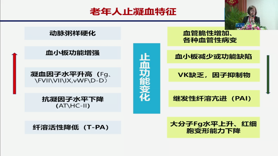 这两方面,无论是我们栓子的形成,还是我们的一个血栓的一个溶解,都是我们需要的。那么对于老年人来说,这两方面和年纪轻有什么不同?我们看到从血管因素来说,动脉粥样硬化,是我们常见的一个老年人的一个疾病,所以它会容易形成血栓,但是我们同时看到老年人的一个血管脆性是增加的,我们在临床上会发现,有什么样的一个病人呢?
