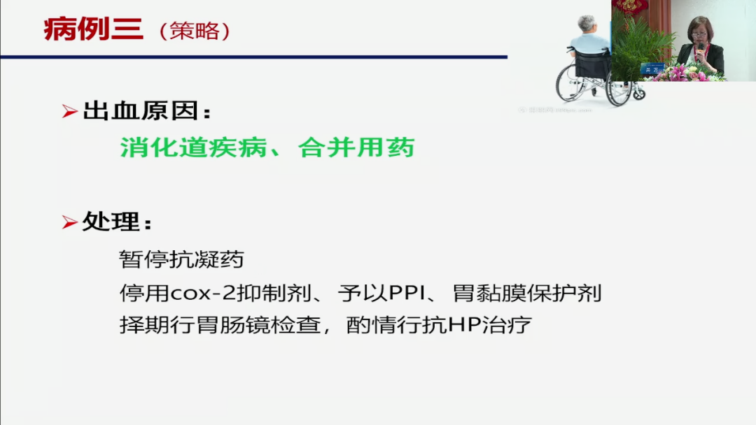 我们要看看怎么样处理并发症?它告诉我们说,如果轻度出血我们可以延迟,可以停止,非致命的大出血我们是建议停止,所以这类患者既然是有消化道的一个出血,那么我们就给他停止了一个药物,但我是停止了,并不是我们后续不进行的一个理由,我们后续要处理,譬如他有合并用药,我们要给他胃黏膜保护结核PPI,我们要做胃肠镜检查,我们要杀掉他的幽门螺杆菌,然后继续我们的一个抗凝。
