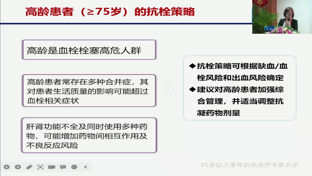 我们看这几点,首先他明确高龄是老年抗衰的一个高危的人群,第二个它告诉我们说,高龄患者有多种合并症,那你这个多种合并症,会对他的一个生活质量和他的预期寿命产生影响,所以你要在进行抗衰治疗的时候,你要评估一下它对生活质量的影响,是不是超过血栓相关症状?那这句话的意思就告诉我们说,如果这个人他是躺在床上生活质量很差,那你是不是还要给他与很接近的一些抗栓的治疗?而第3点它告诉我们说,肝肾功能一定是要我们考虑的东西,因为抗栓药物都是通过这个脏器进行代谢的,而且要告诉我们说由于我们老年人有多重耐药多重用药,所以它要求我们要考虑到药物之间的相互作用,所以整体的一个策略,它定下来说,你要进行一个个体化,要进行一个综综合管理,要进行一个抗凝药物的一个剂量的一个调整。
