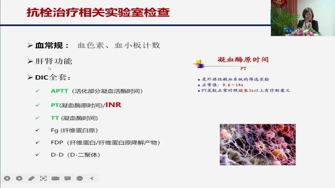 任何的抗栓治疗,我们一定是要关注几个方面,第一个我们血色素,我们为什么要关注血色素?大家去看我们贫血的患者,高血压的患者,包括我们讲的出血高风险的人群,如果你下面还要继续对他进行一个抗栓的,那要去纠正这个贫血,第二个我们要关注的叫血小板的一个技术,关注的血小板的一个功能,所以我们血常规里面对于抗栓治疗这两方面是我们关注,第二个我们要做的是一个肝肾功能,为什么要关注肝肾功能,我们很多的药物都是通过肝肾代谢的,它在一定的程度上它是不能用的,比如我们打比较去小于30就是不能用了,那么立法上办小于15它要减量的,所以我们一个月一次,或者我们至少3个月一次,或者讲你一定要去查他的肾功能,肾功能不一样,然后他的药物剂量不一样,当然我们最主要的就是关注这方面叫DIC全套,关注APTT关注PT关注TT,这个APTT大家都清楚,内源性凝血途径的一个反应,PT反应外源性,TT是反映我们这个纤溶状态的,另外我们关注的纤维蛋白原到底是低还是高,低纤维蛋白原选择也会造成我们出血,还有的就是D二聚体,建议大家以后对于老年人来说,我们入院啊或者感染啊,我们一定是作为一个常规,因为它真的非常敏感,可以给你血栓性疾病的一个提示。