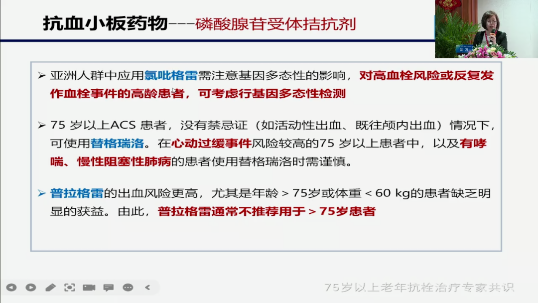 对于另外两个药我们要用完,我们看到75岁以上ACS提格雷罗,可以用吧?可以用,但是你要注意两件事情,第一个这个人是不是心跳慢就心动过缓,第二个就是我们上午我们胡家安教授讲的慢阻肺,有没有那如果有这两类疾病的,提格雷我们是不用的,普拉格雷要用吧,我们看到普拉格雷,通常说不推荐大于75岁的患者,也就是说这三个药里面我们**的就是氯吡格雷,第二个,如果氯吡格雷用了还是我们讲栓子再有,我们有病人是这样的心梗了用了氯吡格雷待会又堵住了,那这个时候就用替格雷了,但注意两大副作用,而普拉格雷目前在老年人身上不用。
