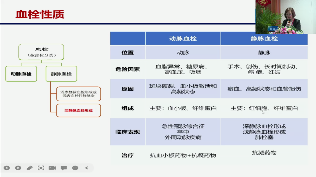 回顾我们整个血栓来说,我们整个血栓可以分为动脉血栓静脉血栓。而动脉血栓和静脉血栓的区分除了它所在的位置的不同,它的一个临床表现的不同,比如我们动脉血栓,主要表现为冠脉综合征,脑卒中,外周血管疾病等等,静脉血栓主要是VT和肺栓塞,更重要的它是一个组成成分的不同,我们看到的动脉血栓,它主要的是由血小板纤维蛋白组成的,所以针对性的我们的一个治疗,就是抗板治疗为主,但是由于,我们刚才和大家复习的整个的一个血栓形成过程,在抗板以后他一定是有凝血的启动,所以它加了一个抗凝的药物,所以我们看,目前我们的一个冠脉综合征的一个,长期的预防,可以抗板加少剂量的一个抗凝的药物。