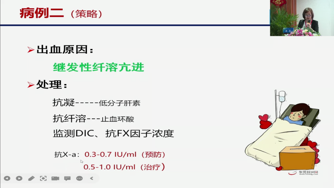这实际上是我们手术,尤其是手术早期我们纤溶异常的一个主要的原因,主要是在于我们讲血栓形成以后,我们有纤溶蛋白原,使得我们整个的一个纤维蛋白溶解,而把整个的一个血栓去去除掉,这个病人他的一个出血叫继发性纤溶亢进,因为我们有血栓就会有纤溶,所以我们对他的一个处理,并不是说让他停抗凝药,而是继续用抗凝药,然后我们用抗纤溶药同时用,那么这个抗凝药是不是剂量过了?我们有一个指标相对来,说有参考价值的,就是抗Fx-a因子的活性,我们讲预防剂量它是0.3-0.7治疗剂量0.5-1。
