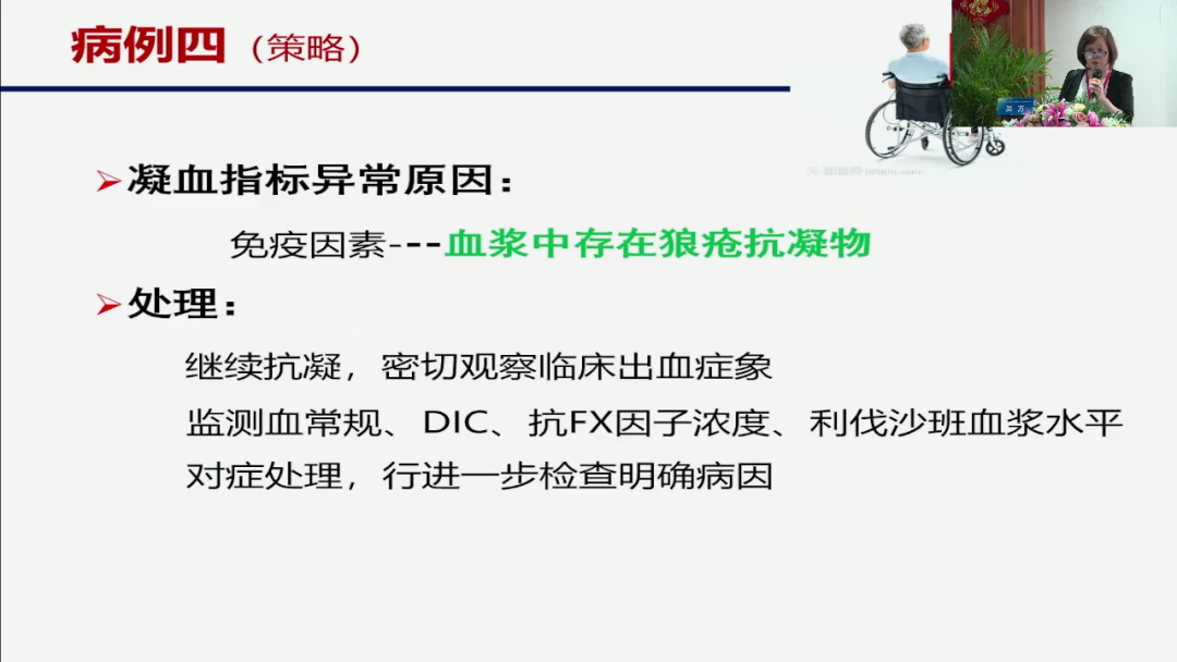 我们来看看他的真正的原因,那么这时候我们就做了一个纠正试验,我们讲什么叫纠正试验?纠正试验我们就是把患者的一个血浆和正常人的一个血浆混合,我们为什么要拿正常人的血浆,因为凝血因子在血浆里如果这个人的一个APTT延长是由于凝血因子缺乏,我们正常人血浆混进去,那他就会正常了,那不然的话他就是其他的一个原因,我们看这个人他用了以后,它的一个APTT和PT并没有纠正,所谓的一个病僵时间还是延长的,所以它并不是说凝血因子缺乏,而是我们讲它有其他物质。联系到他的一个发热和其他的一个症状,这个患者实际上是一个血浆里面有一个狼疮抗凝物质,所以对他的一个处理,我们并不是说停药而是继续一个抗凝,当然出血如果现象太严重的话,那么我们再酌情的一个处理,同时我们进行一个对症的一个处理,进一步的一个明确的一个病因。