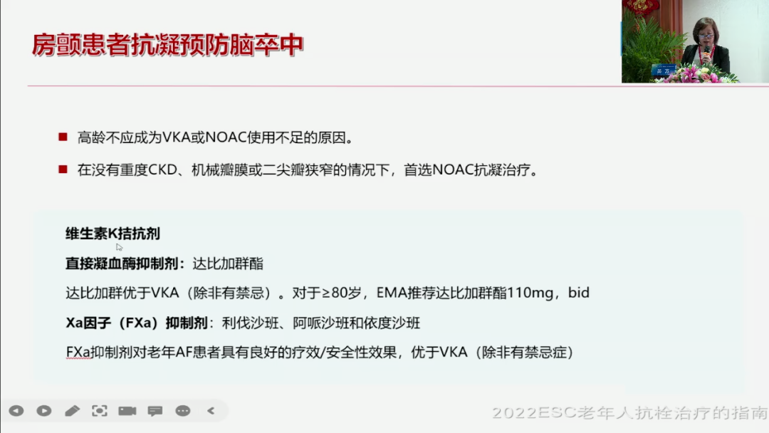 最近几年的一个心脑血管的一个指南来说,它都会告诉你一句话,它说新型口服抗凝药的一个选择,它是优于华法林,这个地位的一个变化也是近年来随着我们大型临床结果或者我们临临床应用的一个结果而产生的一个改变,所以我们现在来说,譬如我们这个房颤抗凝他说,高龄不应该成为它使用不足的原因,所谓的使用不足,因为我们经常会担心有这个人年纪太大了,我们要给他少一点,剂量少一点时,时间短一点。但实际上来说,这是还是要个体化的一个分析,还是要我们考虑到他是不是一个出血风险的一个大,对于我们整个的一个选择来说,我们排队排在第一名的就是新型口服抗炎药,包括十因子抑制剂包括二因子抑制剂,维生素k是在前两者不能用的一个情况下的一个选择。