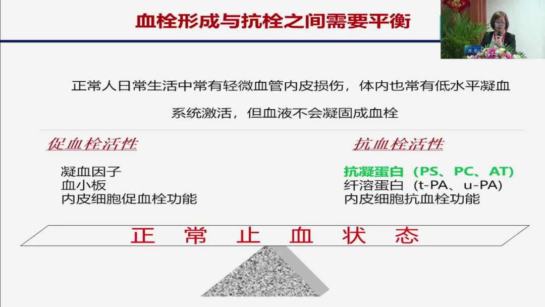 那么我们血栓形成以后,这个血栓是不是一直存在在我们血管里?那如果一直存在在血管里,就是我们血栓性疾病了,那事实上不是,为什么我们人体有血栓形成的一系列的一个促血栓活性的机制,包括我们的凝血因子,包括血小板,但同时它有抗栓的,我们看到的譬如抗凝蛋白,包括蛋白s,蛋白c,包括我们的一个纤溶,所以在正常情况下,我们既能够有在受损或者手术的情况下,有栓子给它堵住我们的一个窗面,又能够在各种各样的因素下,使得这个血栓溶解。那么这样就能保证我们人体所需要的,所谓的血栓与抗衰之间的一个平衡。