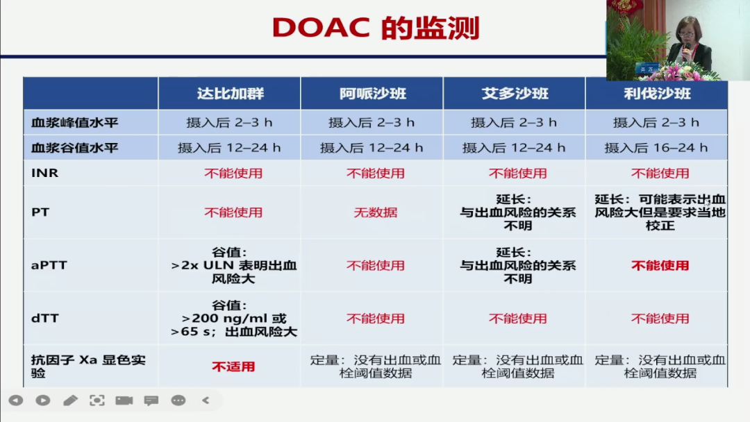 我们看到达比加群的话我们能够用的是什么?APTT我们用什么INRPT对它是不行的,我们的立发三班是用什么,我们用的是一个抗湿因子活性,或者是一个PT,因此这些值,但是他就告诉我们说,他说延长可能表示出血风险大,并不是有一个预值在里面,也就是至今为止,如果你用新型口服抗炎药,没有一个数值告诉你说你正正好好不像华法林,有什么1.6-2.5这么一个范围在里面,而抗蚀因子来说,它会提示你是不是太高。