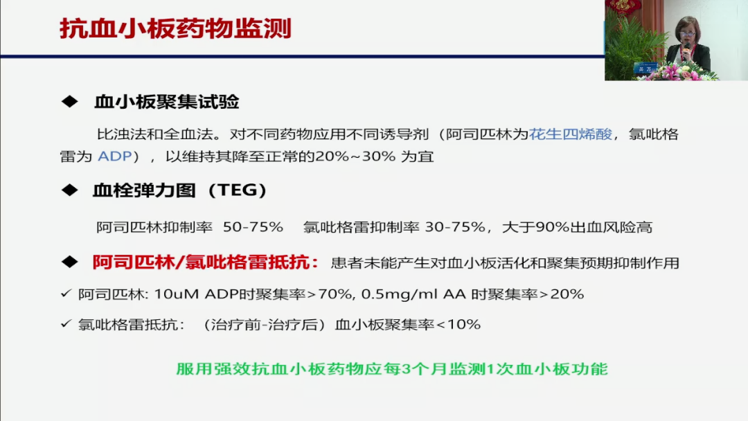 对于抗血小板药物来说,我们讲了我们知道它的一个数量的话,但是这些血小板它是不是有作用,也就是我们讲一个功能的检测,我们检测什么功能?我们讲血小板聚集试验以及血栓弹力图,就是我们现在目前,临床上能够获得的,或者最常用的一个方法,你做血小板聚集试验,如果说这个人用了以后他的一个聚集力没有下降,那说明他是没用的,聚集力小于20%那证明是过头了,那也就是说你要减量的,如果说聚集试验做了以后,你还是有疑惑或者你这有条件的话,你更**的就是做一个血栓弹力图,我们血栓弹力图有血小板图,它就告诉你说,你这个血小板的抑制率到底是多少,比如我们要求的阿司匹林的抑制率是50%-70%,那么如果大于90%那你要减量了,如果说是50%60%那你怎么办,60%你要加点量,如果小于50%怎么,说明这个药是没效的?这就是我们抗板药物的一个监测,另外的话你要注意一个现象,就是所谓的阿司匹林或者氯吡格雷的一个抵抗,这个是什么意思,也就是说你用了药以后对这两个药都是没用的。那这有一个概念就是,如果说阿司匹林的ADP聚集率大于70,或者是阿司匹林的一个聚集率大于20%,那就是阿司匹林抵抗,如果说氯吡格雷在用前和用后他的一个血小板聚集率的一个变化小于10%那就是一个氯吡格雷的抵抗,这个时候你是要换药的,所以指南告诉我们说强效的抗血小板药物,3个月监测一次血小板的一个功能。