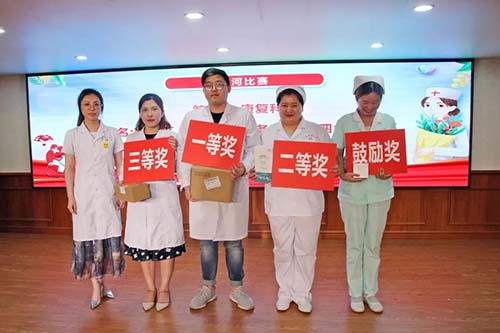 为庆祝5.12国际护士节,上海金城护理院也举办了丰富多彩的系列活动,为节日增添了风采,吴增均院长宣布了拔河比赛、卡拉OK、双人绑腿百米跑比赛获奖团队和个人名单,刘丽君、张彦青、徐东红院长分别为大家颁奖,并合影留念。