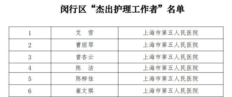 其中,上海市第五人民医院、上海金城护理院等40家医疗机构闵行区“杰出护理团队”荣誉称号,我院徐天立、臧晓艳等429名护理人员闵行区“杰出护理工作者”荣誉称号。