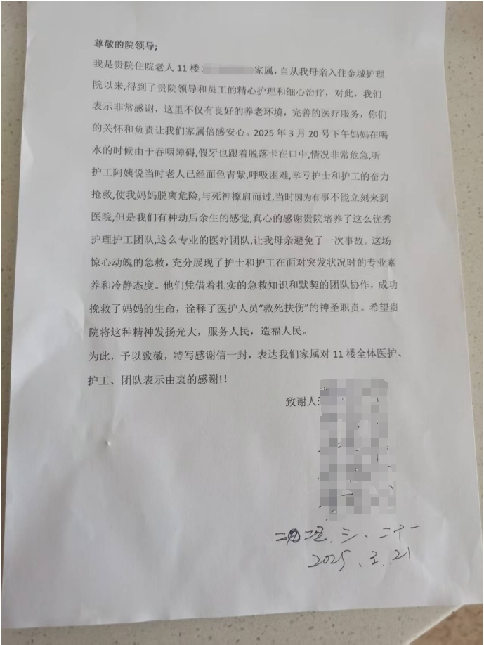 近日,上海金城护理院护理、护工团队收到了一份特殊的感谢信与荣誉锦旗——一份来自患者家属的深情感谢。这份感谢背后,是一场发生在病房内的惊心动魄的生命救援行动,充分展现了金城护理团队的专业素养与责任担当。