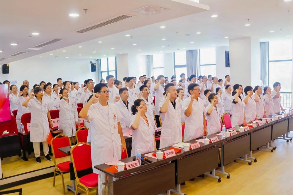 随后,全体医师身着洁白的大褂,在业务院长的带领下,高举右拳,庄严重温誓词:“我志愿献身人类的健康事业,自觉维护医学的尊严和神圣,敬佑生命,救死扶伤,平等仁爱,尊师重道……” 激昂的誓言在整个会场回荡,这不仅是对职业的郑重承诺,更是对每一位患者的责任担当。