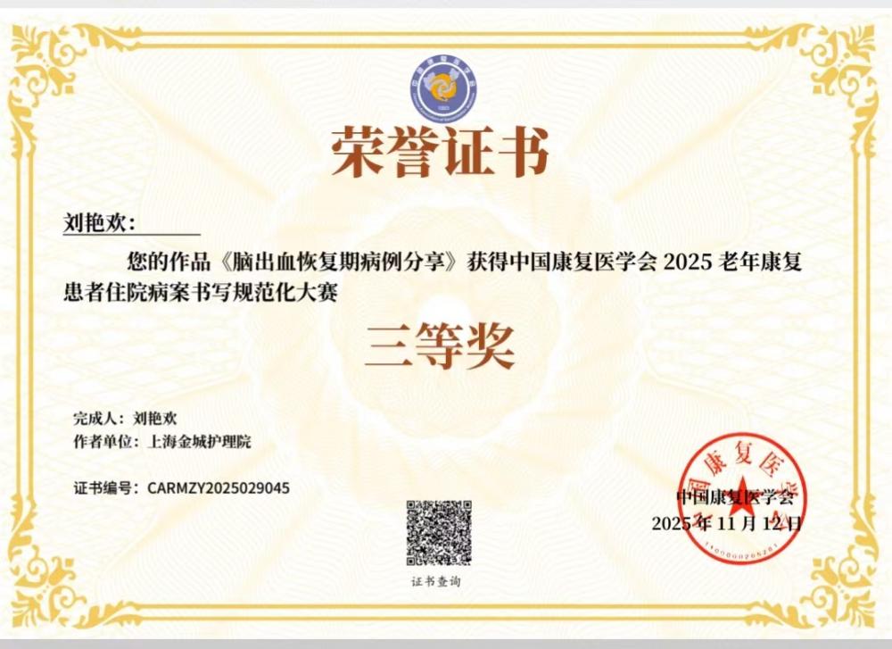 大赛评审阶段,由国内老年康复、病案管理领域的**专家组成评审团,按照统一标准从病案书写规范性、诊疗思路清晰度、康复方案针对性、医疗文书逻辑性等多个维度进行严苛打分。上海金城护理院参赛书写的病历——《脑出血恢复期康复病例分享》,凭借条理清晰的病案结构、详实准确的诊疗记录、专业规范的医学表述,以及对老年康复患者个体化需求的**把握,在众多参赛队伍中脱颖而出,最终荣获本次大赛三等奖。